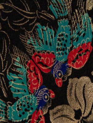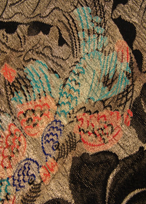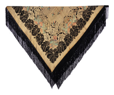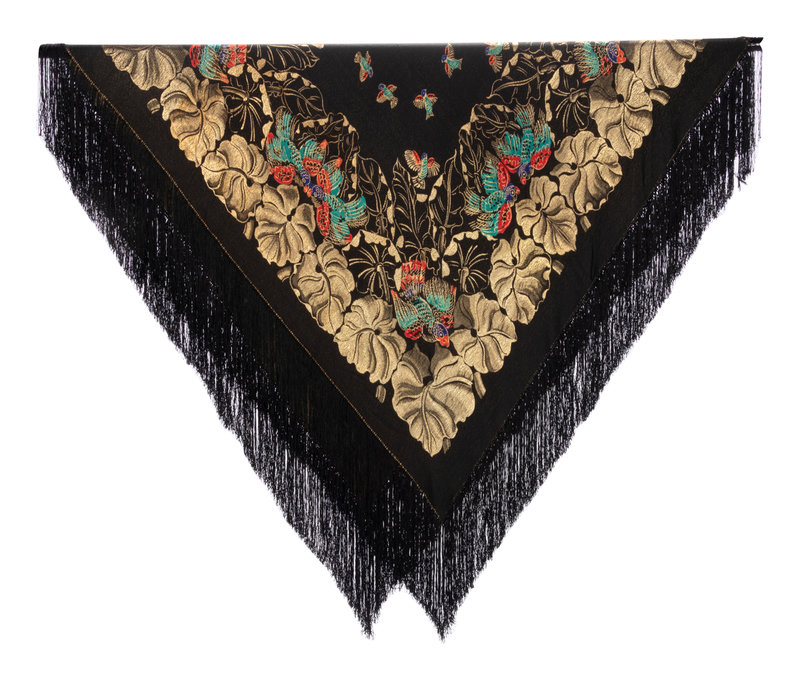 Black crepe woven with gold metallic thread and multi-hued silk threads and finished with long black chain fringe.