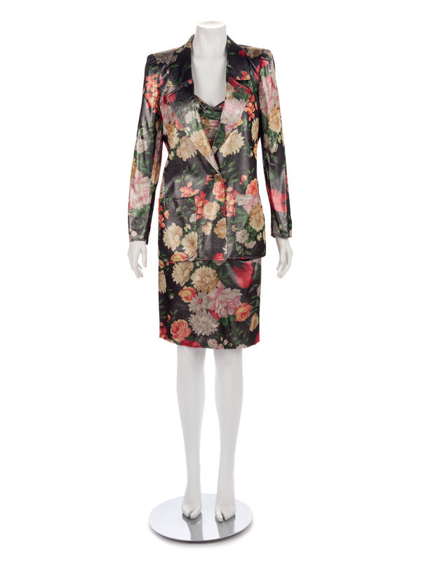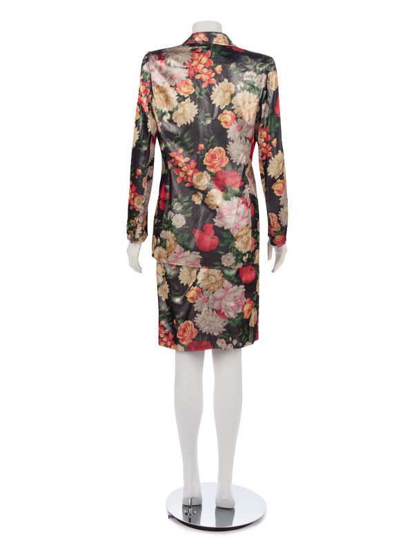 Black with floral print lame suit jacket, matching bustier, and high waist skirt.