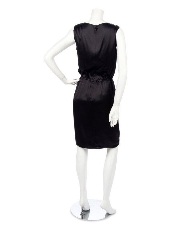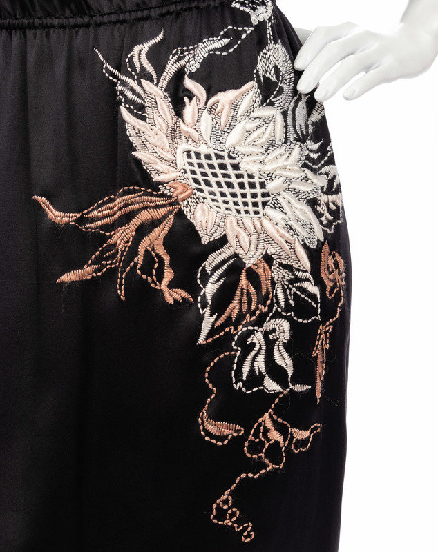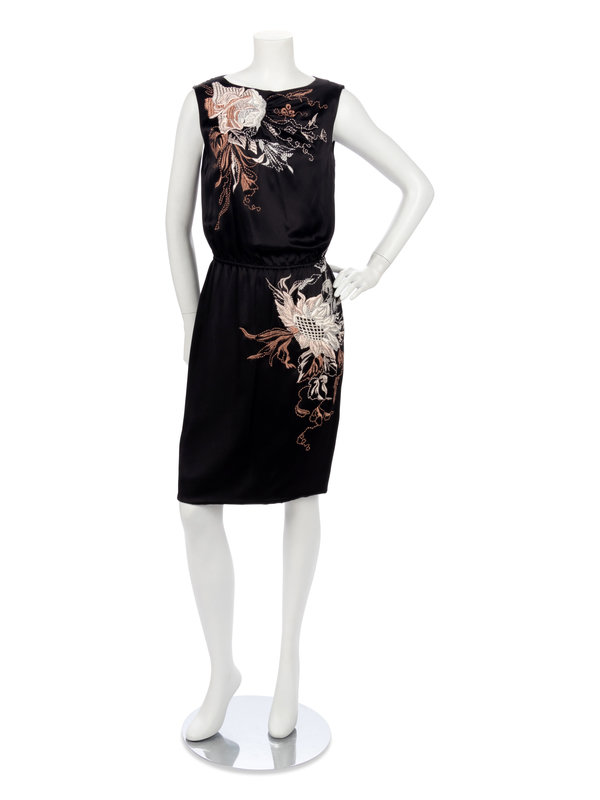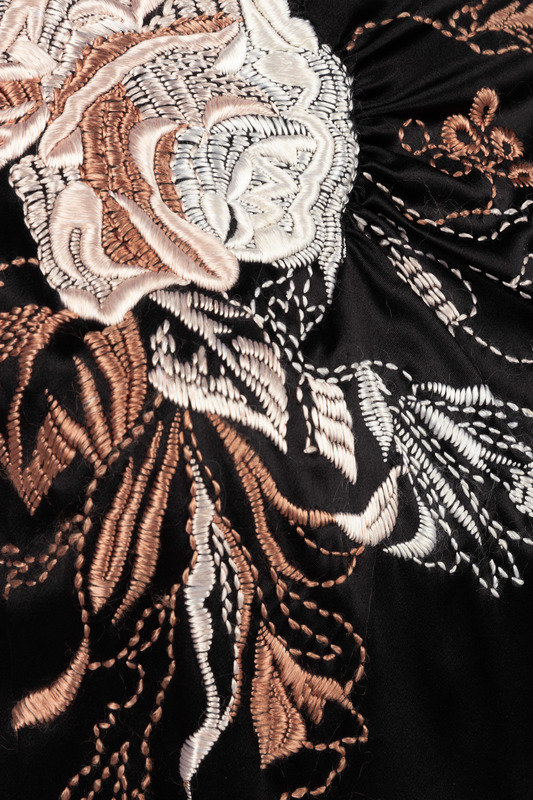 Black silk satin sleeveless dress with cream, brown, and tan silk thread embroidered floral motif.