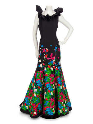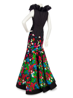 Black silk taffeta sleeveless mermaid dress with multi-hued floral print on hemline, ruffled neckline, and left side zipper closure.