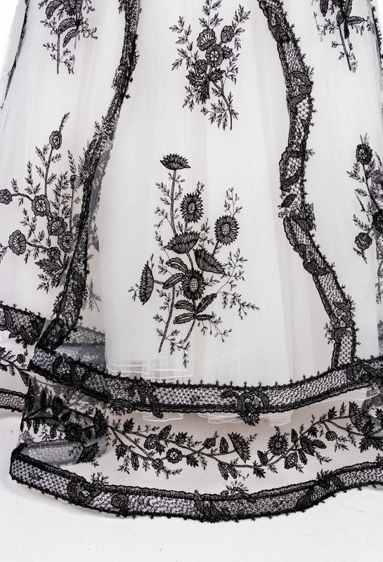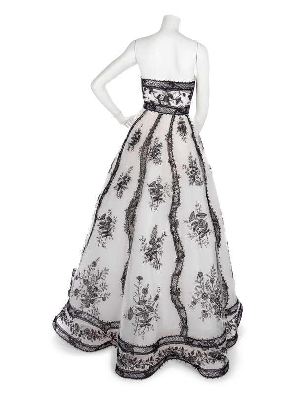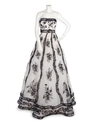 White net and satin strapless evening dress with full skirt and black floral embroidered lace overlay.
