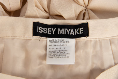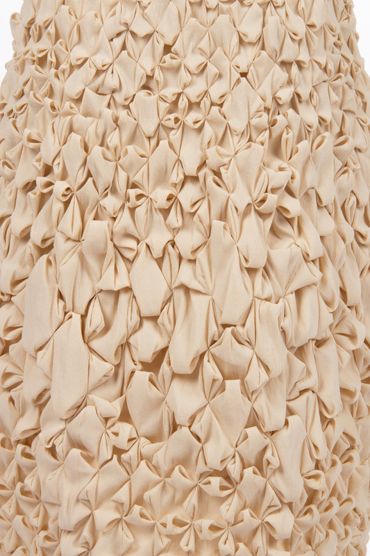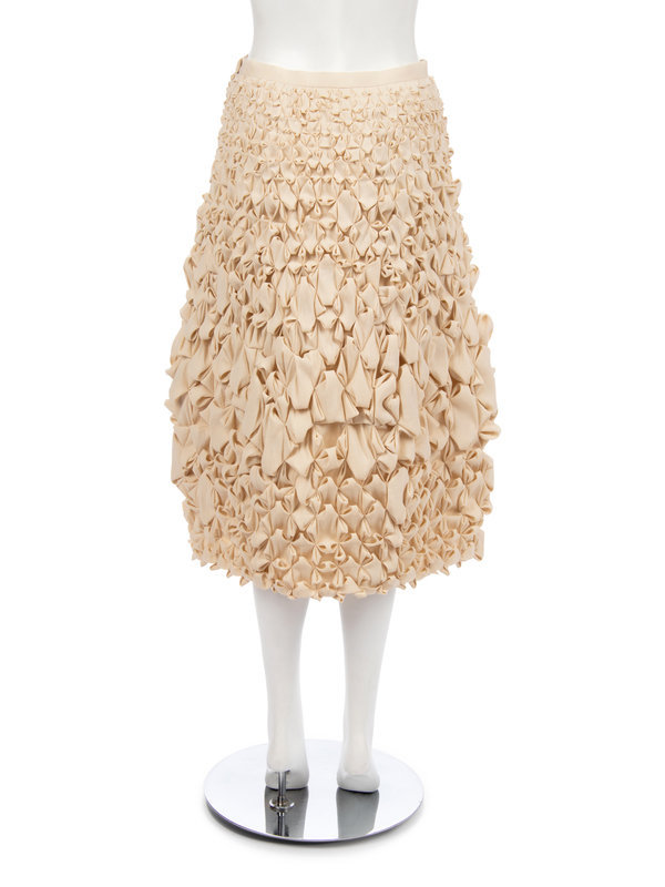 Cream polyester blend crepe flared skirt with folded and gathered over skirt.