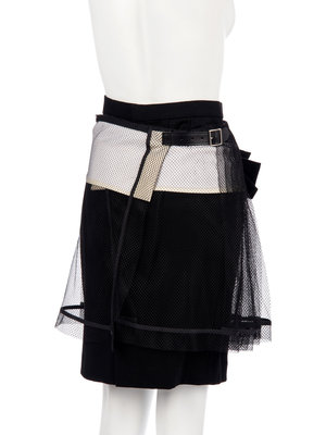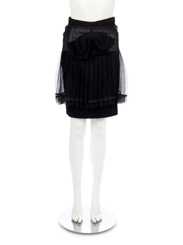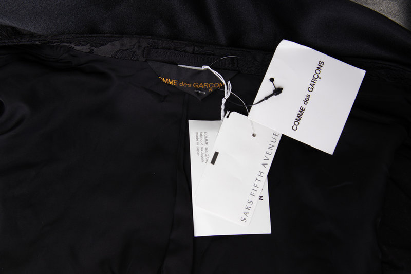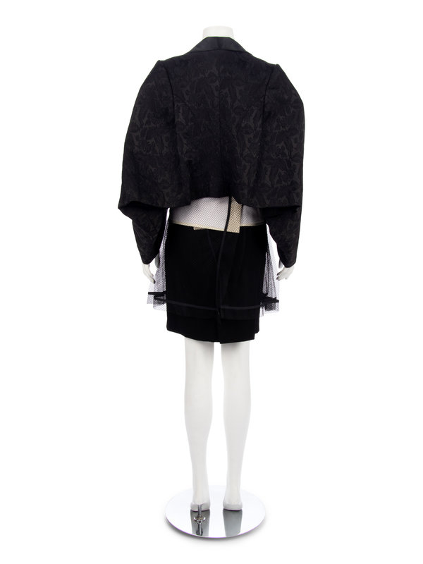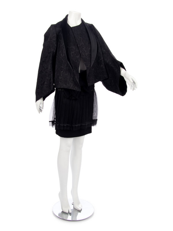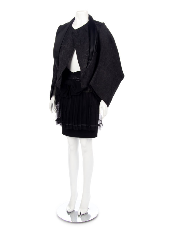 Black acetate/polyester blend jacquard clutch jacket with kimono sleeves and satin shawl collar; paired with black wool skirt with pleated polyester net and cowhide belt.