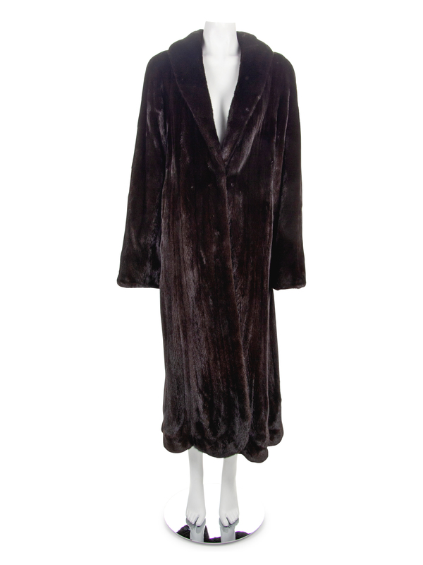 Natural dark brown mink shawl collar full-length coat with two hook center front closures and two front side hidden pockets. "M S C" monogram is embroidered on front inside lining.
