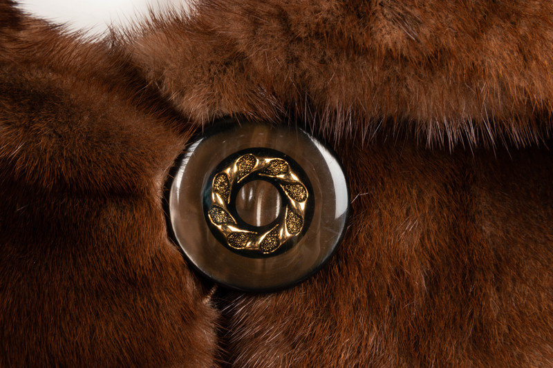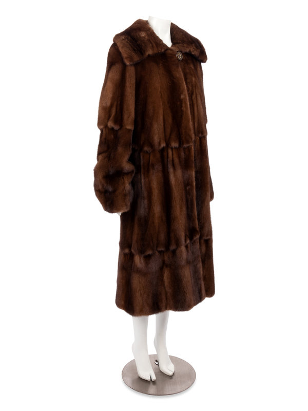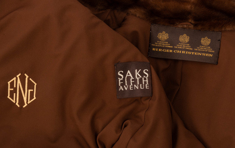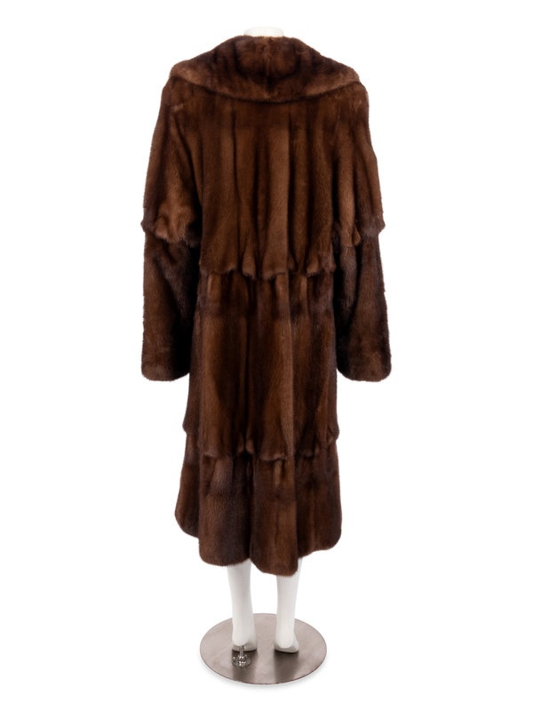 Brown mink fur tiered coat with exaggerated roll collar, flared sleeves, front hip pockets, and center front hook clasp closures. 'ENA' is monogrammed on the front right lining.