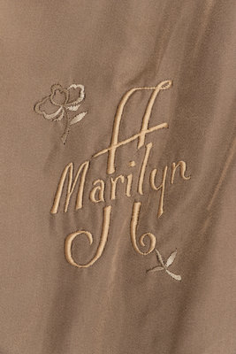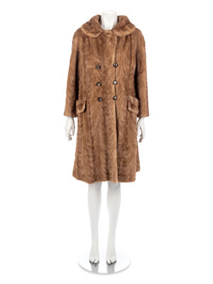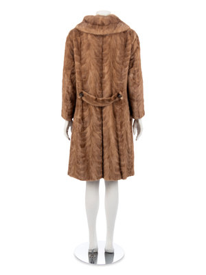 Butterscotch mink double breast coat with rounded single notch lapel, long sleeves, side hip pockets, back waist cinch, and brown resin buttons. Front right is monogrammed with "Marilyn"