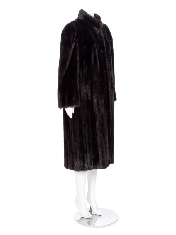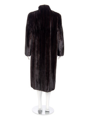 Dark brown mink fur coat with stand collar, straight fit sleeves, front hip pockets, and center front hook and eye closure. Fabric lining reads 'Faberge' and has 'ENJ' monogrammed on front right lining.