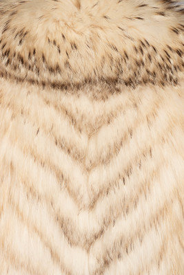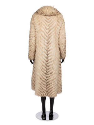 White and brown badger fur coat with exaggerated point single notch collar, straight fit sleeves, front hip pockets, and center front hook and eye closure. Lined in cream satin and the front right lining is monogrammed with 'ENJ'.