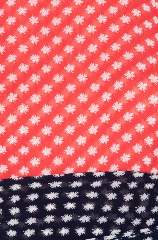 Red and blue crepe with white flower print day dress with full gathered sleeves, wrapped tie waist, and full gathered skirt.
