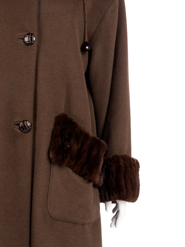 Army green wool coat trimmed with dark brown sheared mink on drawstring collar, cuffs, and patch pocket welts. The buttons are brown molded metal to appear as leather knots.