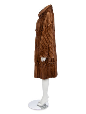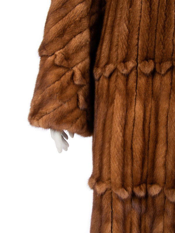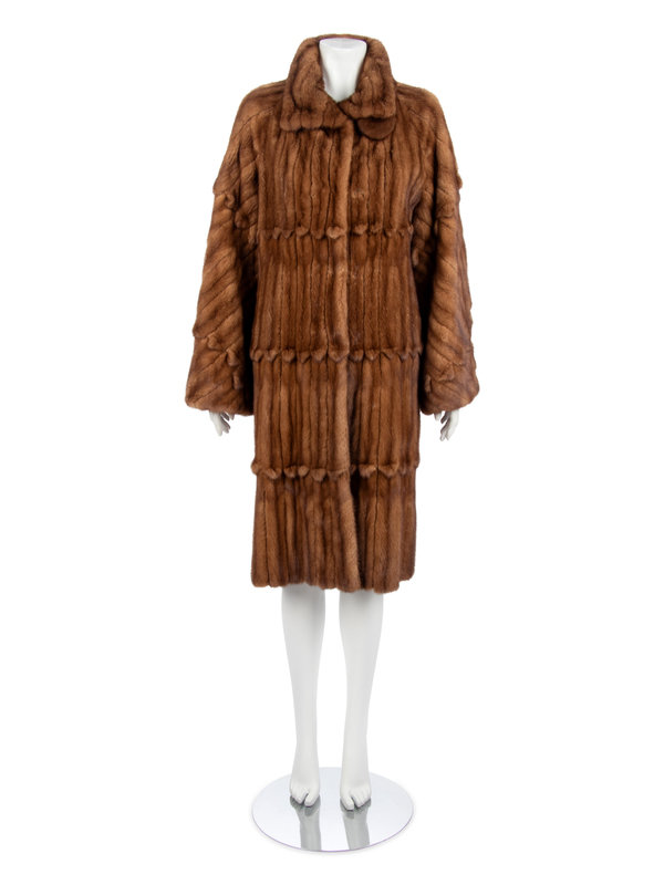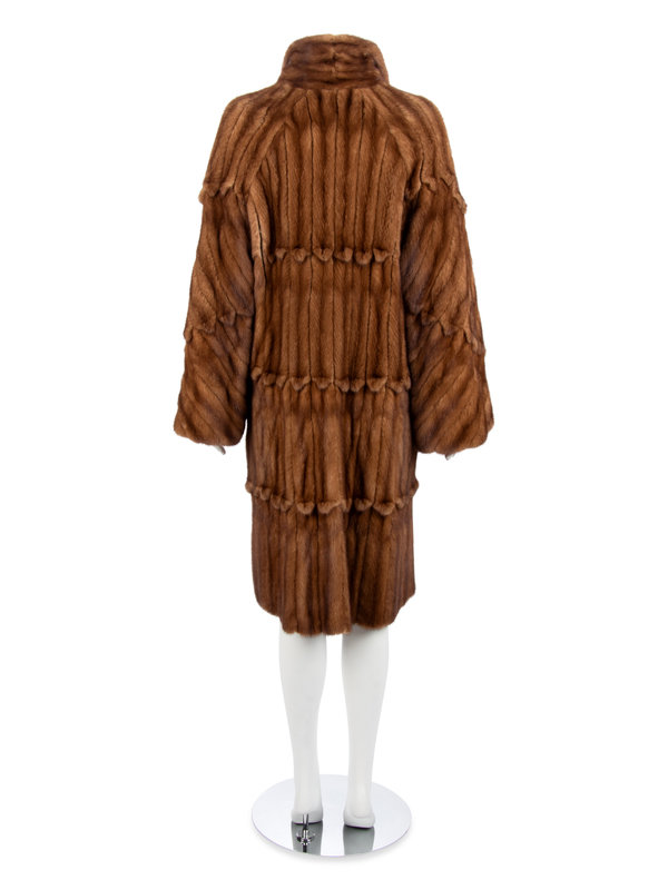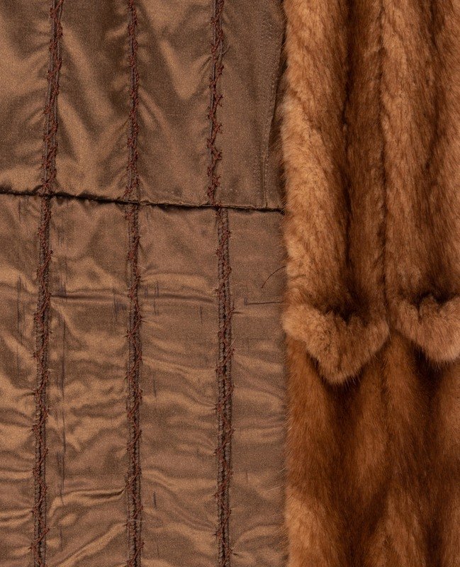 Light brown strip mink coat lined in gold silk taffeta with decorative fagoting stitches, roll collar, wide raglan sleeves, and snap front closure.