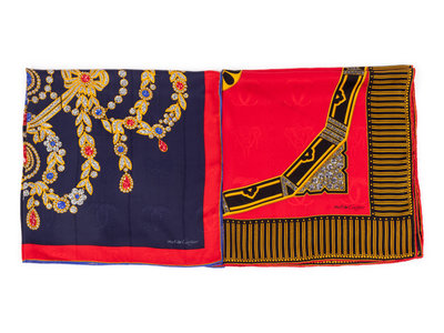 Red silk brocade scarf with jeweled bow design and navy border. Comes with a box.