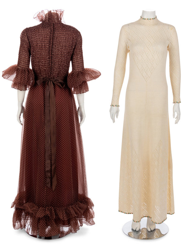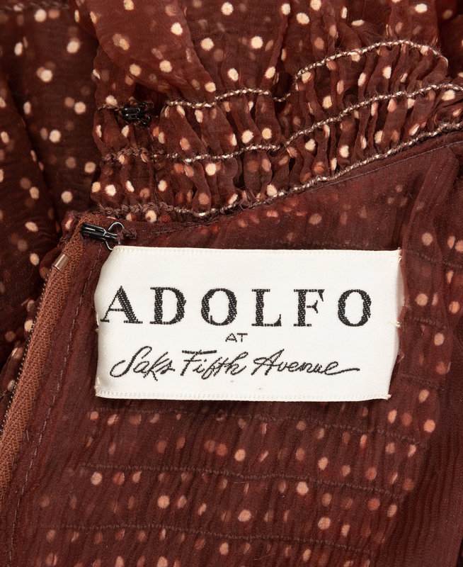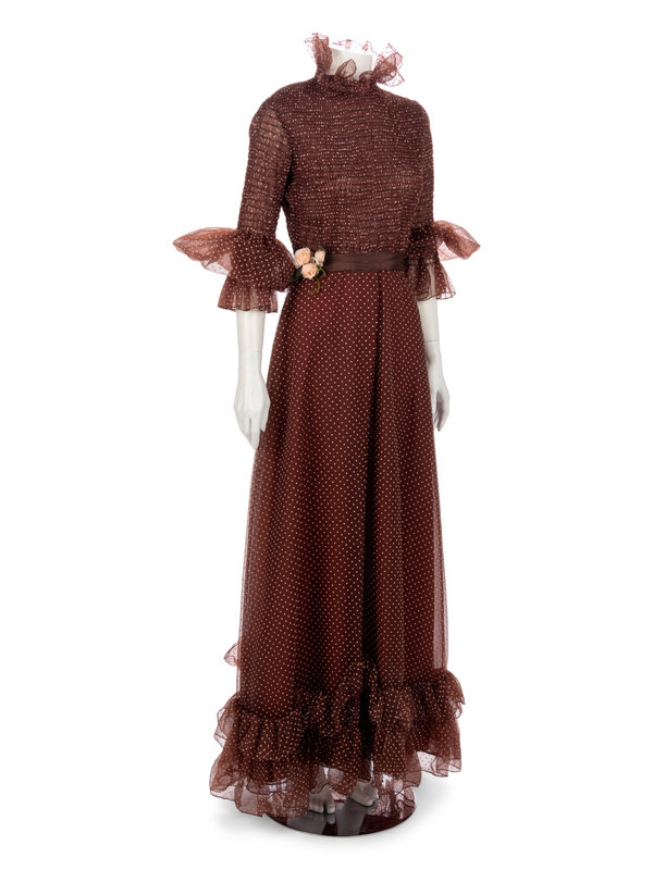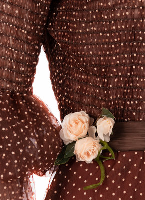 Brown with white dotted Swiss long sleeve dress with ruffled collar, smocked top with puffy and ruffled long sleeves, full skirt hemmed in ruffles, and moire ribbon belt with pink fabric flowers.