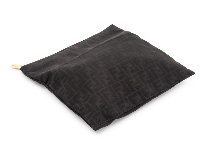 Black FF logo fabric square zip bag with orange satin interior. Comes with a dust bag.