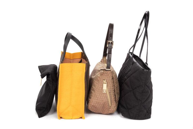 Black FF logo fabric tote bag with black patent leather trim and handles, center zip closure, and lined in black fabric. Comes with a dust bag.