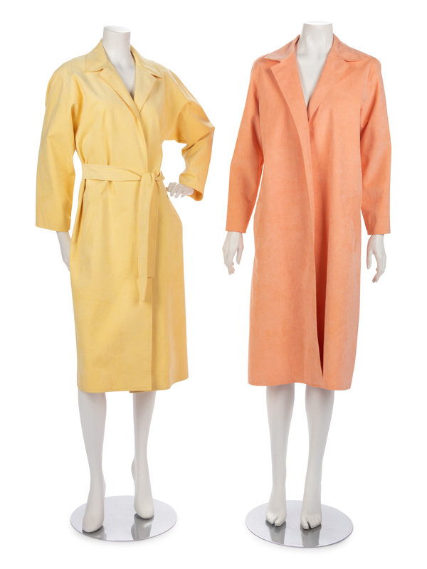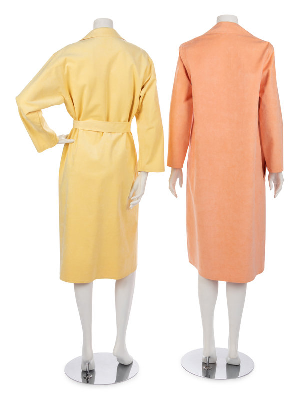 Yellow suede-like long coat with single notch lapel and tie waist belt.