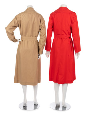 Tomato red trench coat wide lapels and attached tie waist belt.
