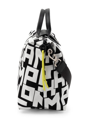Black woven tote bag with 'Longchamp' in white print, black leather handles with neon yellow accents, silver-tone hardware, top zipper closure, and adjustable shoulder strap.