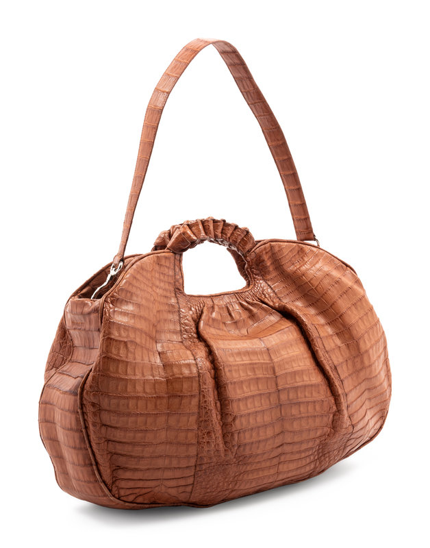 Tan crocodile gathered hobo bag with braided handle, detachable shoulder strap with silver-tone hardware, top magnetic closure, and lined in tan suede. Comes with a dust bag.