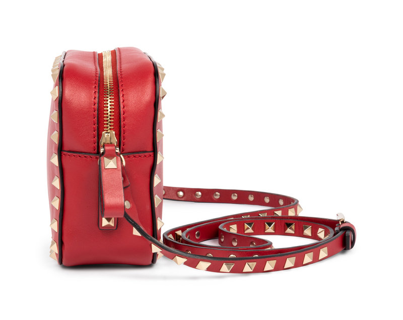 Red leather and gold-tone Rockstud cross body camera bag. Comes with natural canvas dust bag.