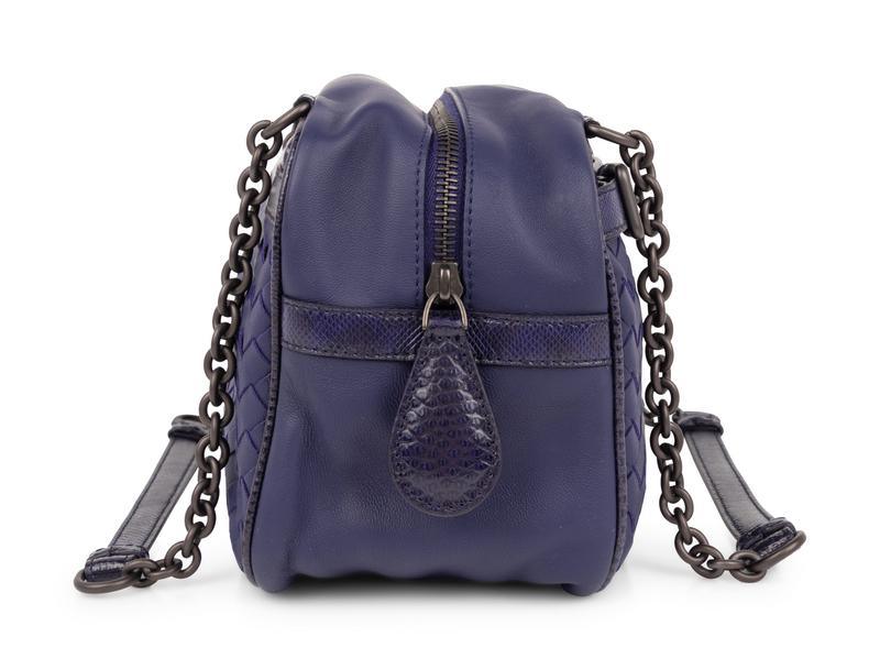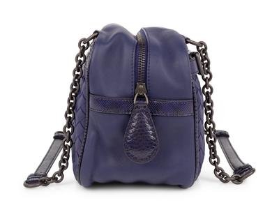 Blue leather with blue Karung and chain strap and lined in tan suede. Comes with BV dust bag and envelope on the inside with a BV mirror.