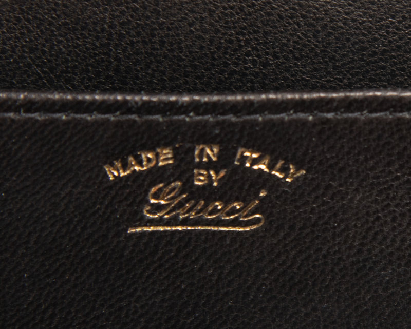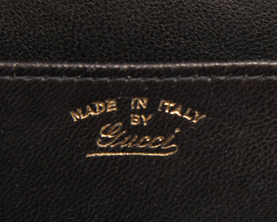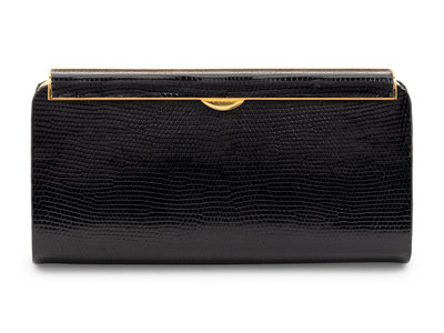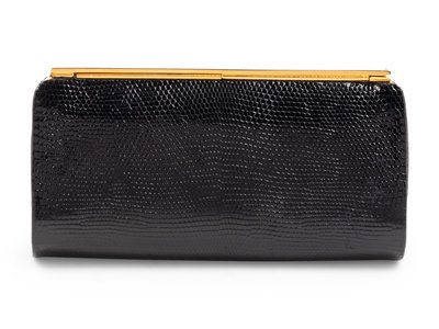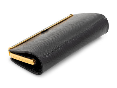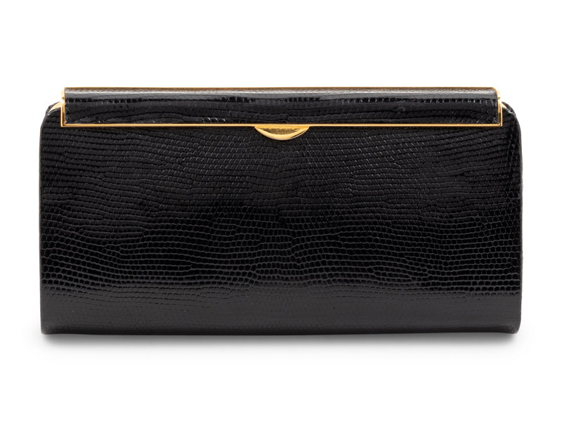 Black lizard skin frame clutch with gold-tone hardware and lined in black leather.