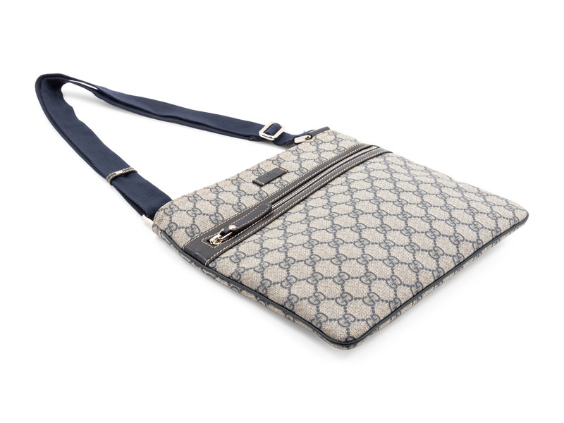 Blue/gray GG Supreme canvas messenger bag trimmed in blue leather and adjustable blue braided strap and silver-tone hardware. Comes with a dust bag.