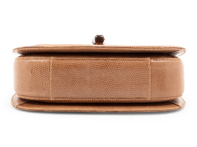 Tan lizard skin handbag with stained bamboo handle and gold-tone hardware, flap top, and front bamboo twist closure; paired with tan leather single fold wallet and mirror.