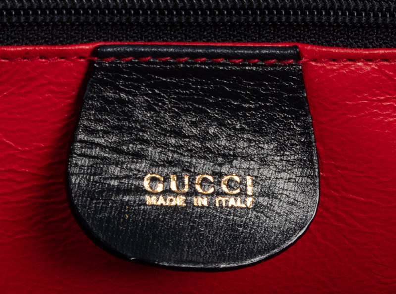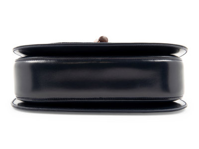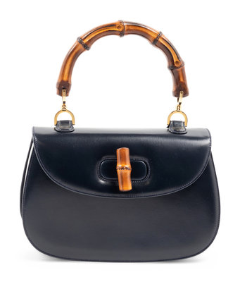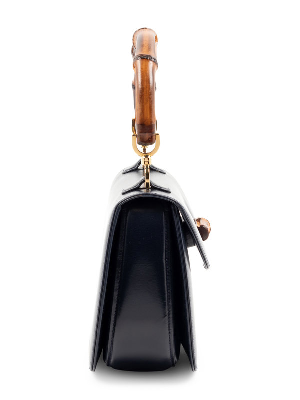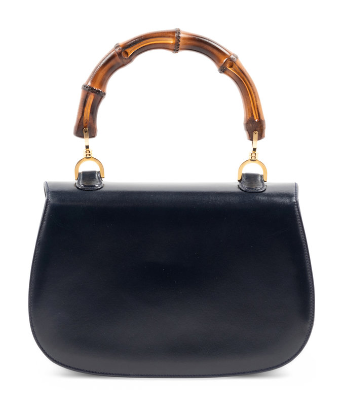 Navy leather hand bag with bamboo handle and gold-tone hardware, removable leather shoulder strap, lined in red leather with zipper and slip pocket, and front bamboo toggle closure. Comes with dust bag.