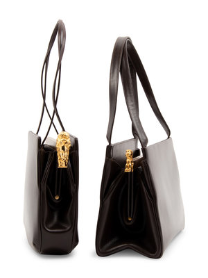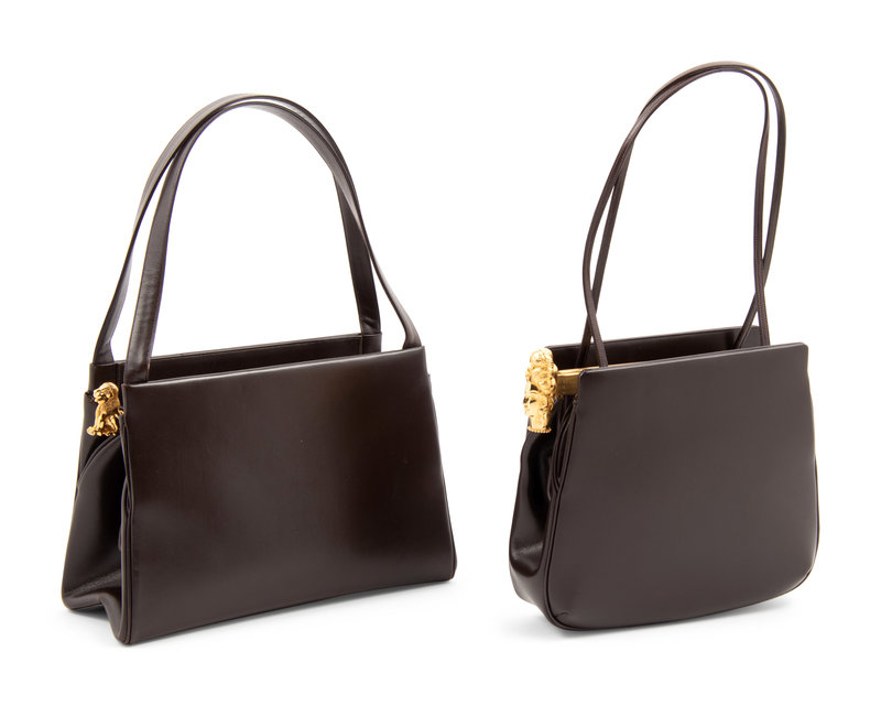 Dark brown leather frame bag with gold-tone lion figure clasp and lined in dark brown fabric.