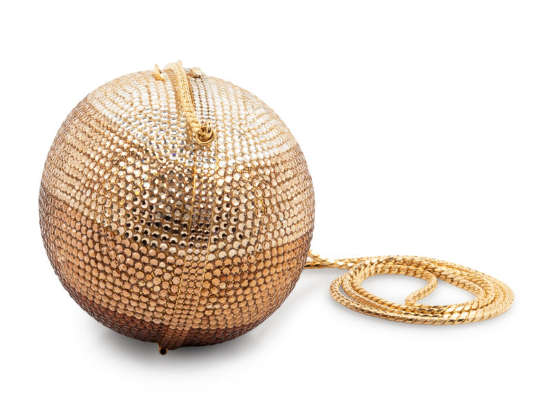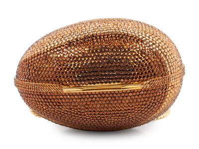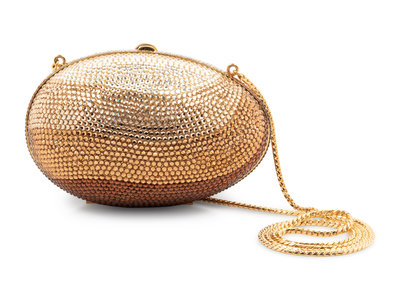 Multi-toned brown layered rhinestone egg minaudière set in gold-tone hardware, top pressure clasp closure, chain shoulder strap, and lined in gold leather; paired with tasseled comb, mirror, and coin purse. Comes with a dust bag.