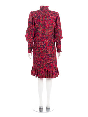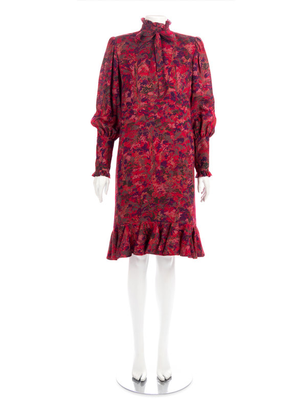 Red tapestry with purple and green print dress with ruffled neckline, sleeve cuffs and hemline, and a tie belt.
