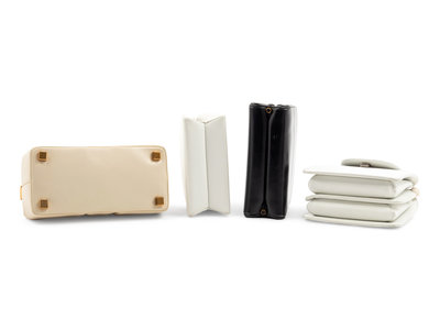 Ivory leather doctor bag with gold-tone hardware, side hinge closures, and peg feet, and lined in ivory fabric; paired with mirror and coin purse. Comes with dust bag.