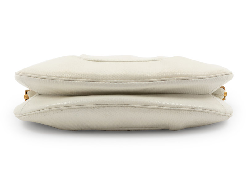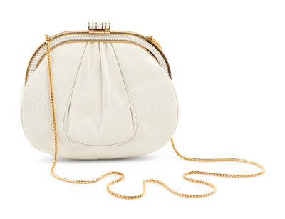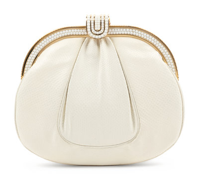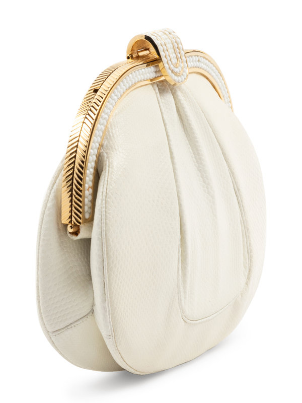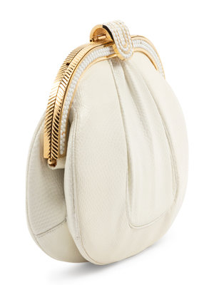 White karung snake shirred gold-tone frame bag with white faceted rhinestones; paired with tasseled comb, mirror, and coin purse. Comes with dust bag and box.
