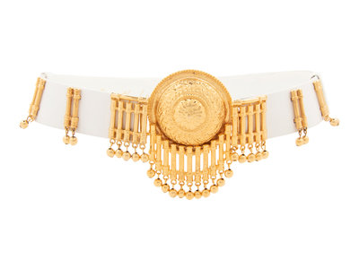 White adjustable leather belt with gold-tone floral pattern buckle. Comes with a dust bag.