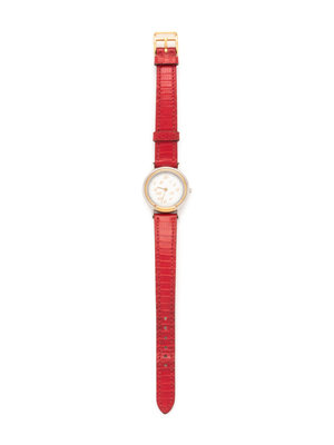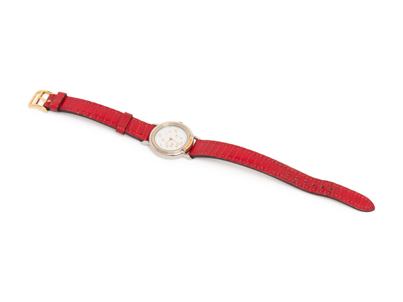 Red skin leather banded watch with polished gold/silver-tone and white Quartz face. "Swiss Made" on lower face and Hermès stamped in gold-tone metal. Reverse has Hermès horse and cart and "H" etched into the casing. Comes with dust bag.