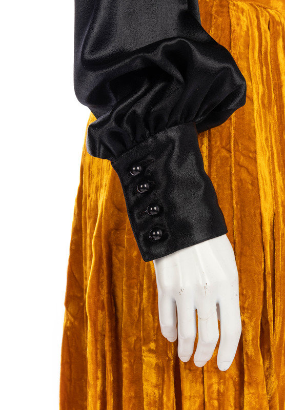 Black crepe-back satin blouse with exaggerated pointed collar, black globe bead buttoned cuffs, and half front lace up closure with tie.