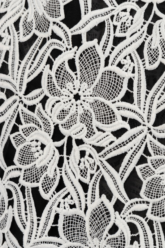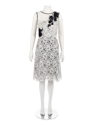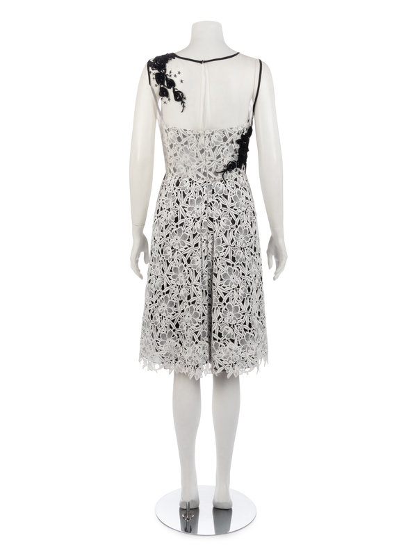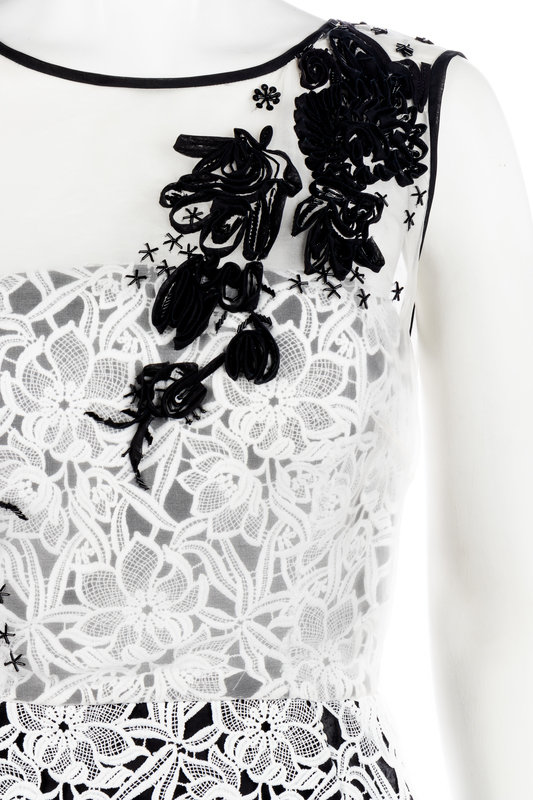 White lace overlay sleeveless dress with white organza yoke embellished with black ribbon and bugle beads, structured inner bodice, full skirt with back side pleats, and center back zipper closure.
