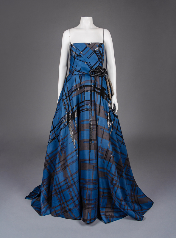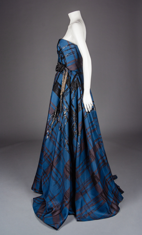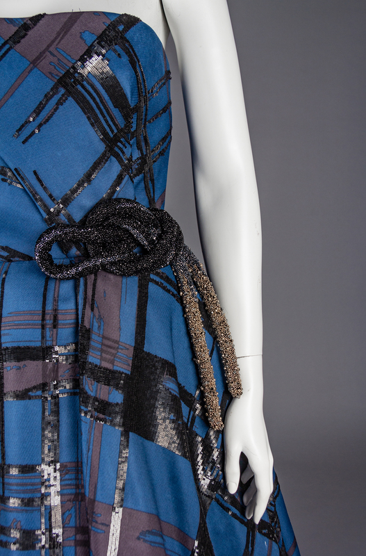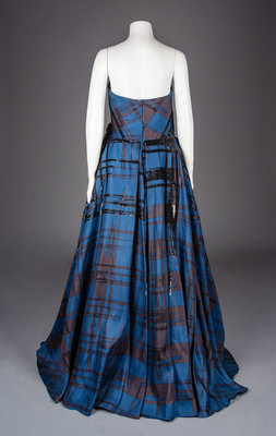 Strapless dress in blue silk twill printed with black 'brush strokes' in a plaid pattern, which is embellished with square black sequins near the hips, waistline and over the bodice. The bodice and skirt are draped and tucked into the left waistline, which is further embellished with a large beaded bow in an ombré pattern. Hidden in the tucks on each side of the dress are pockets in the skirt. A boned inner bodice supports the strapless dress, with a very full skirt supported by five petticoat layers. The front hem of the dress has been taken up with hand-stitching. The rest of the hem is unaltered.