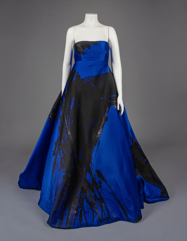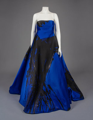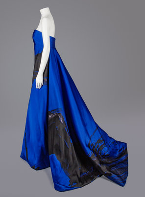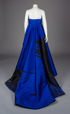 Strapless dress with a very full skirt and train made of a bright blue silk woven with a stylized pattern of asymmetrical brush strokes in black and shiny threads. The inner bodice is heavily boned and the full skirt is supported with stiffened inner layers. One slip pocket sewn into each side seam of the skirt. The dress is fully lined and closes down the center back with a zip.