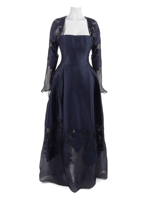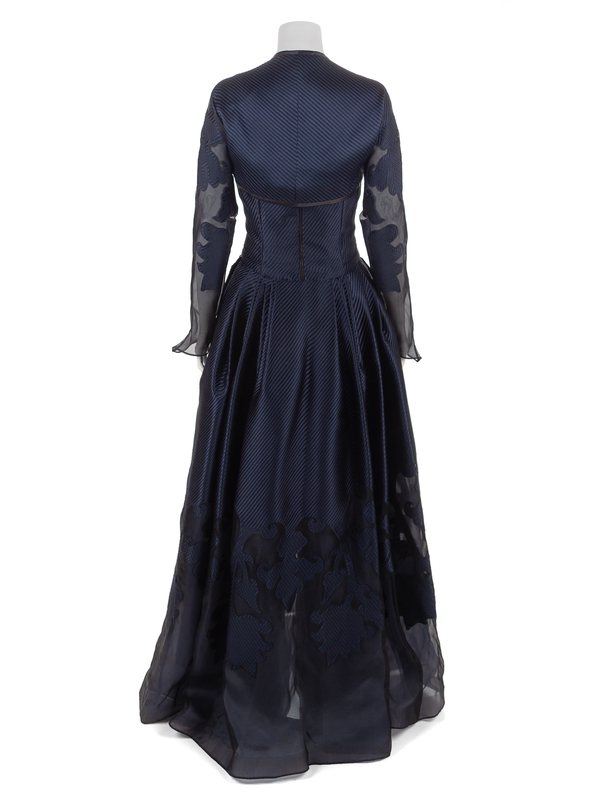 Strapless dress of black sheer fabric woven with diagonal stripes of dark blue satin that morphs stylized fauna pattern at the hem, revealing a semi-transparent hem. There is a heavily boned inner bodice and a dark blue taffeta lining that extends into a petticoat. The very full skirt is pulled into deep pleats around the waist, with extra deep pleats at the center back. The dress closes down the center back with a zip and hook and eyes. into a floral design around the wide, sweeping hem. The very full skirt is lined with black polyester and has a long train. A series of hook and eyes and zips close down the center back. A matching, long sleeve shrug jacket attaches to the top of the strapless dress with hook and eyes.