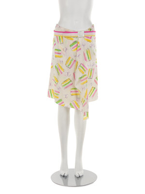 White silk with pastel floral print wrap skirt; paired with similar colored striped grosgrain ribbon and white leather backed slide buckle belt.