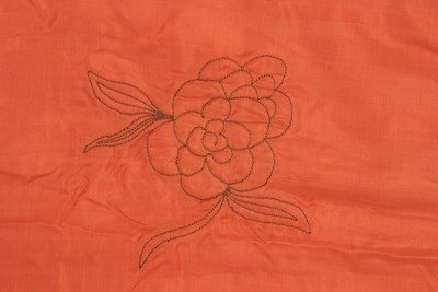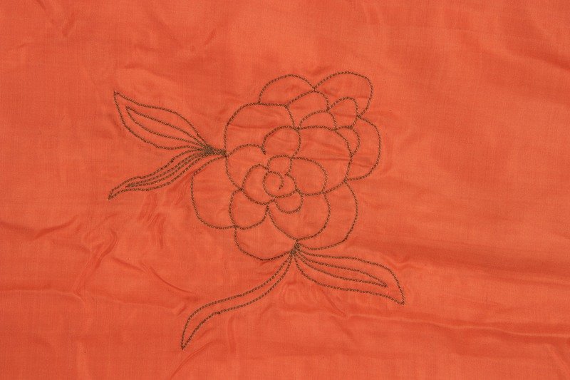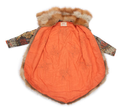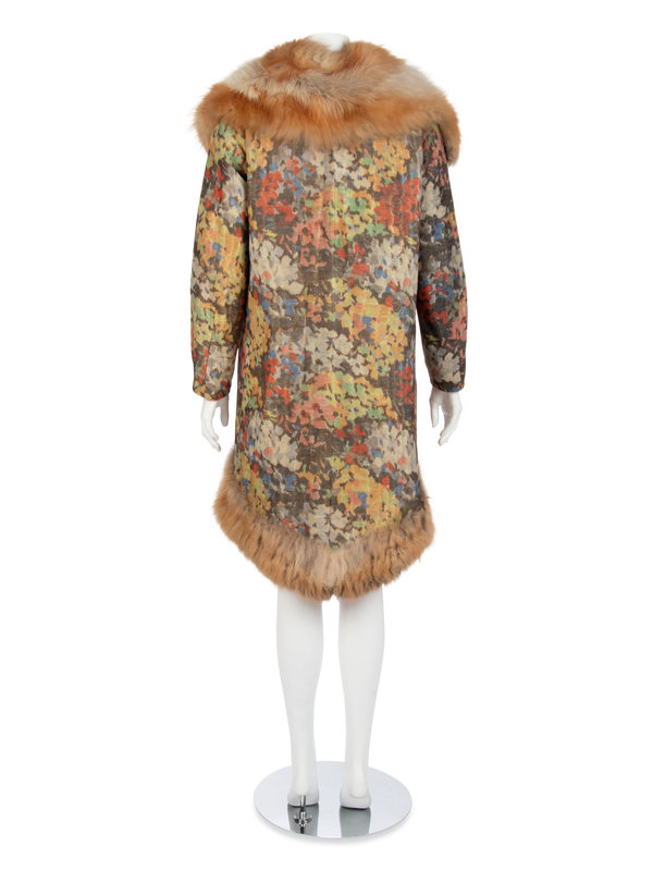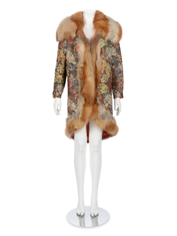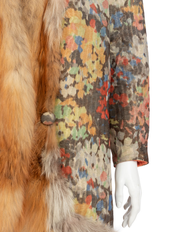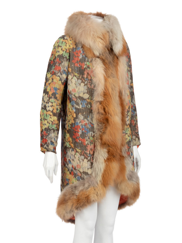 Multi-hued and metallic thread jacquard coat trimmed with red and off-white fox fur along the collar and hemline, lined in orange faille with floral embroidery, and front button closure.