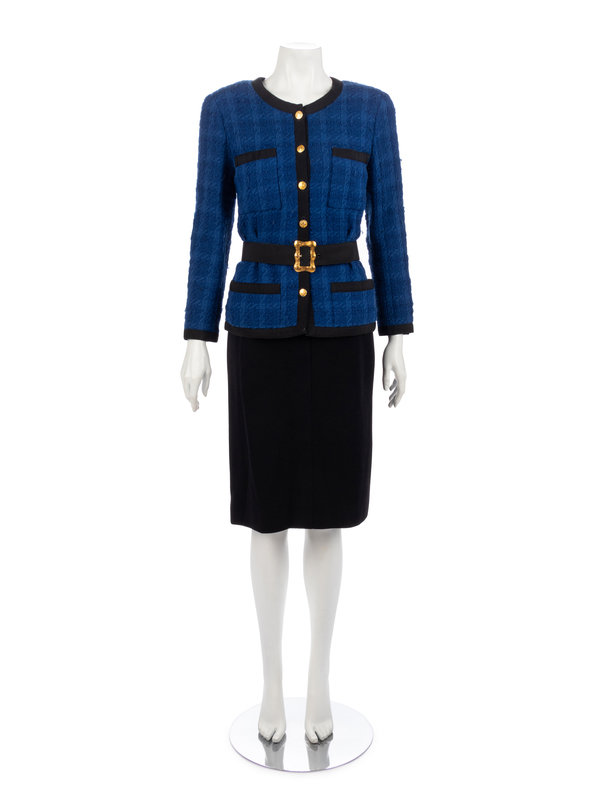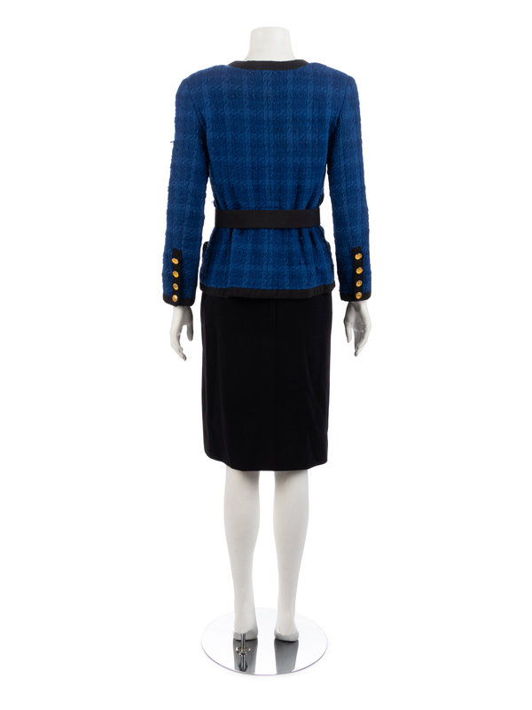 Blue plaid wool bouclé suit jacket trimmed in black grosgrain ribbon, and gold-tone button front closure; paired with black wool interlock knit pencil skirt and black grosgrain ribbon belt with gold-tone metal buckle.