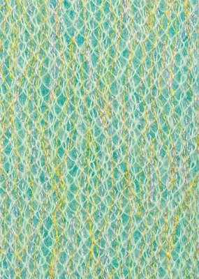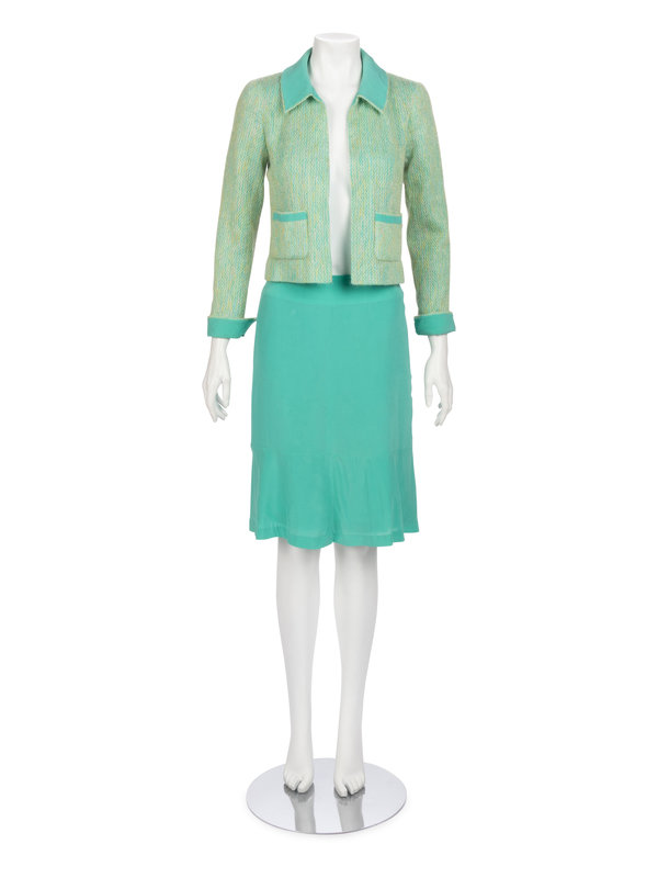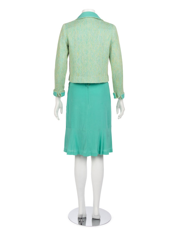 Variegated mohair blend chain stitched felt jacket faced and lined in teal silk chiffon; paired with matching teal chiffon straight skirt with flared hemline.