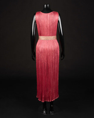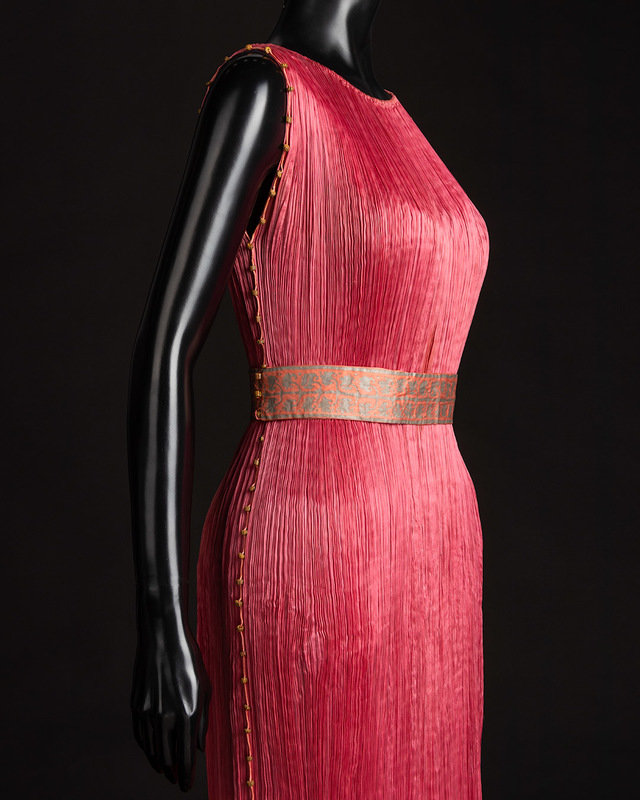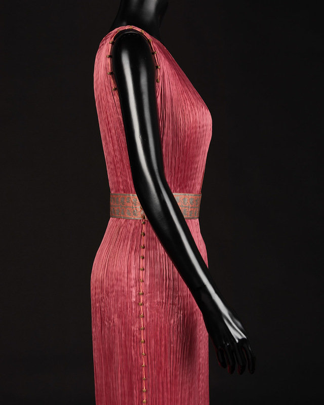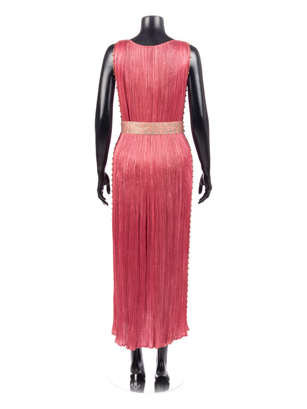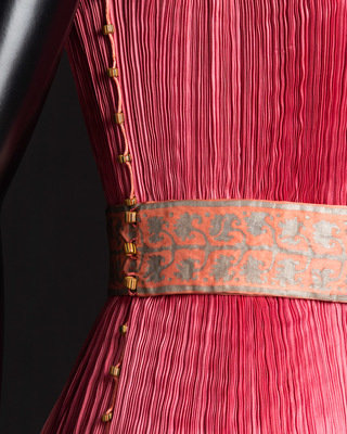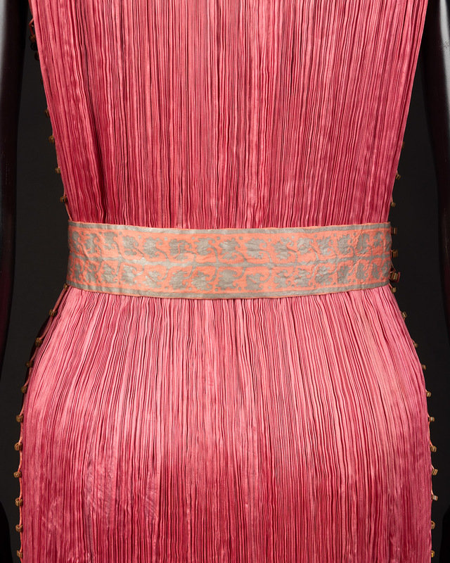 Deep pink sleeveless pleated Fortuny "Delphos" dress with satin cord and hand painted Venetian beads along armholes and side seams; paired with metallic hand painted light pink silk satin belt with hand painted Venetian bead closure.