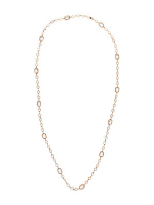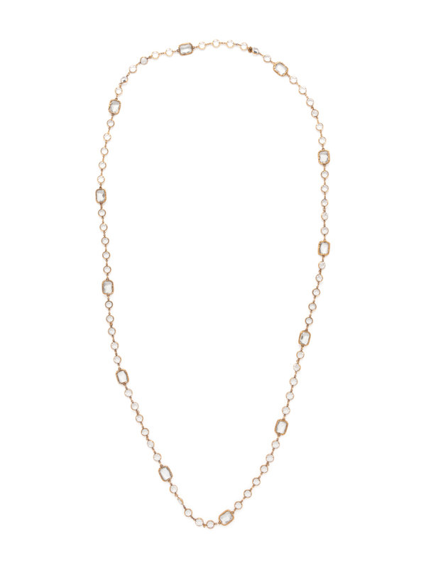 Clear faceted rectangle and circle cut crystal sautoir edged in gold-tone metal fittings and chain. Comes with a box.