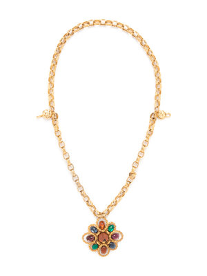 Gold-tone engraved chain-link necklace with red, blue, green, and orange glass stones set in hanging pendant.