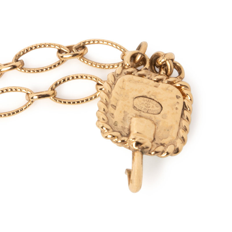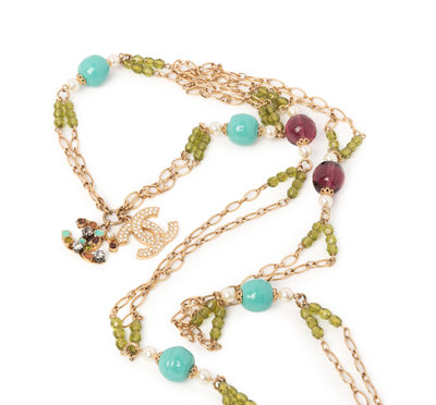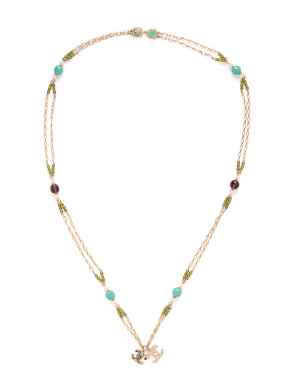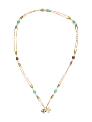 Gold-tone chain necklace with blue and purple glass beads, faux pearls, and green faceted beads, two CC logo charms, one gold-tone with rhinestones and one gold-tone set with semiprecious stones, and hook closure. Comes with a box.