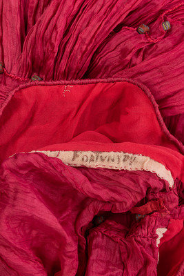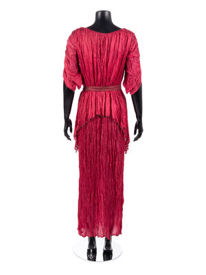 Fuchsia silk satin pleated Fortuny "Peplos" dress with half length sleeves, top draped tier, and trimmed in braided satin cord and hand painted Venetian beads; paired with matching silk satin hand painted belt.